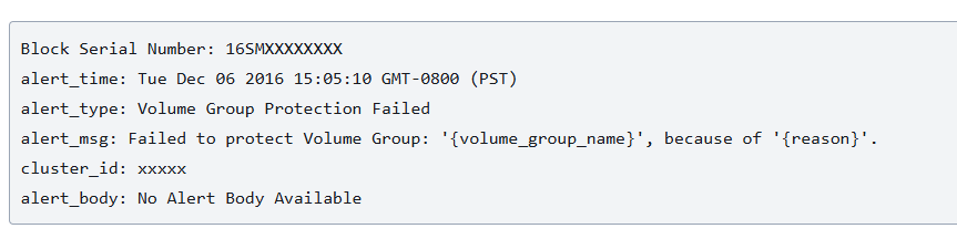 An administrator has received an alert A130351 – VolumeGroupProtectionFailed details of alert as shown below: