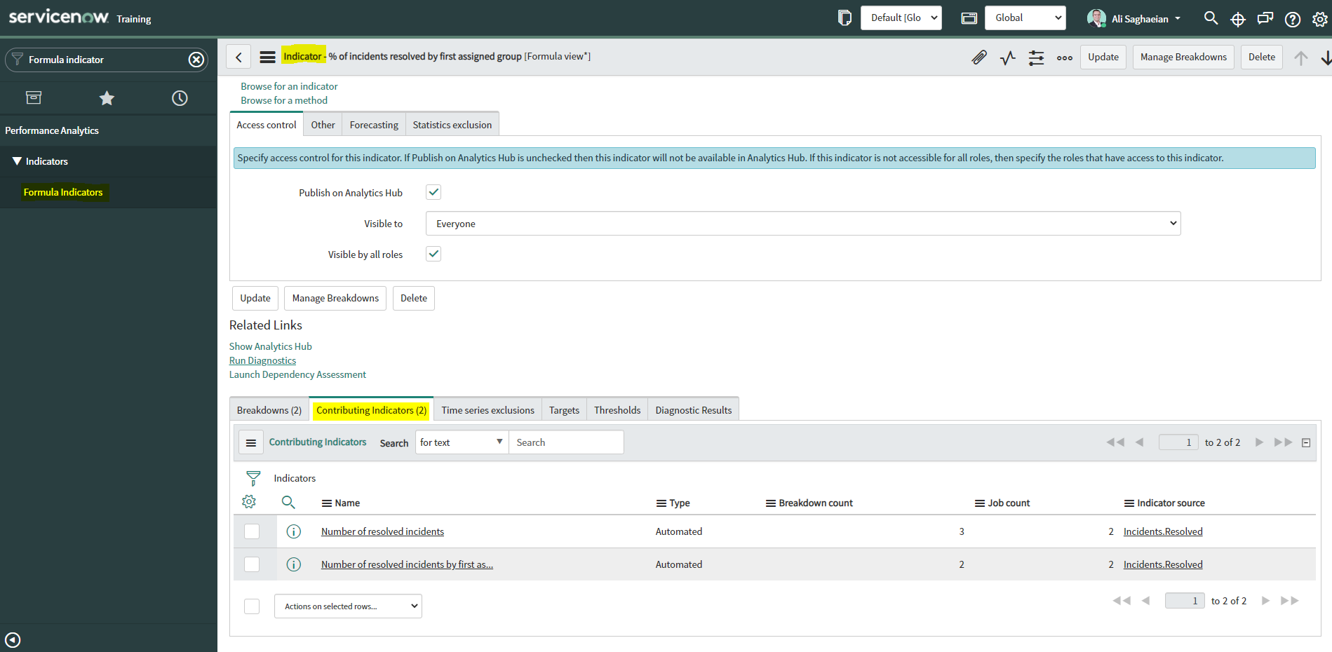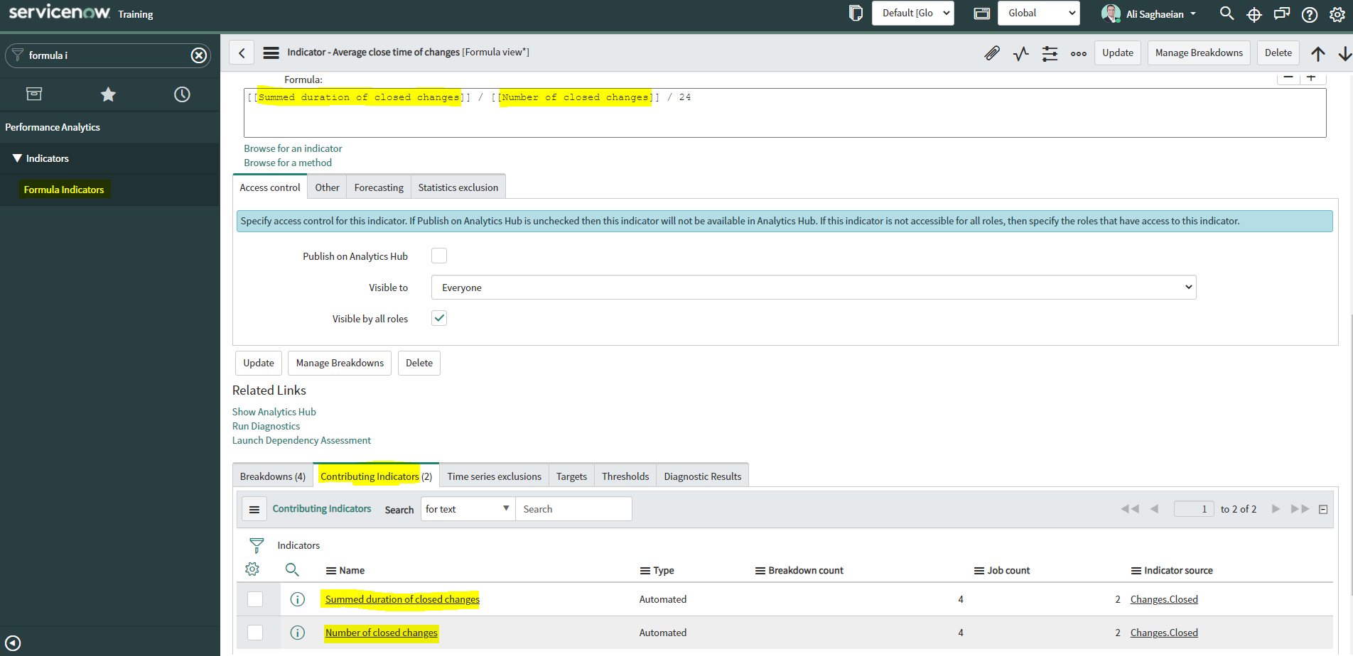 Use the Contributing indicators related list to navigate to the indicators used in the formula or their indicator sources. If you include another formula indicator in the formula, both that indicator and its contributing indicators are listed.