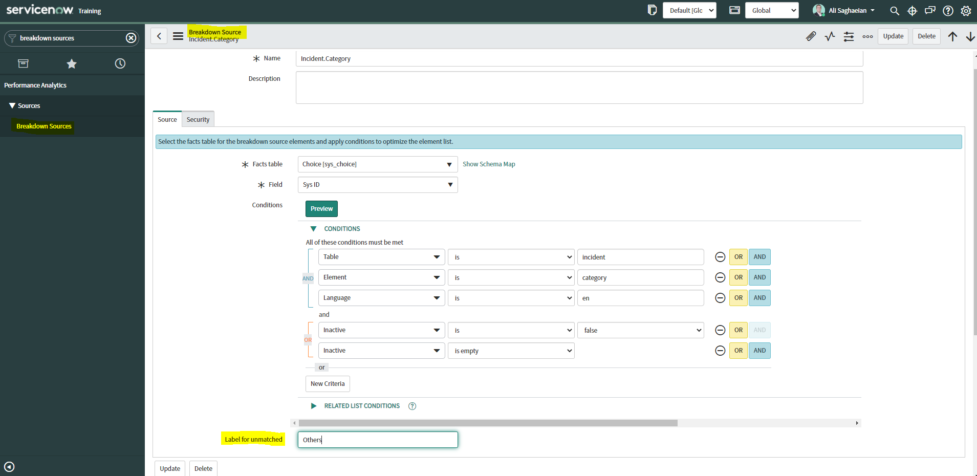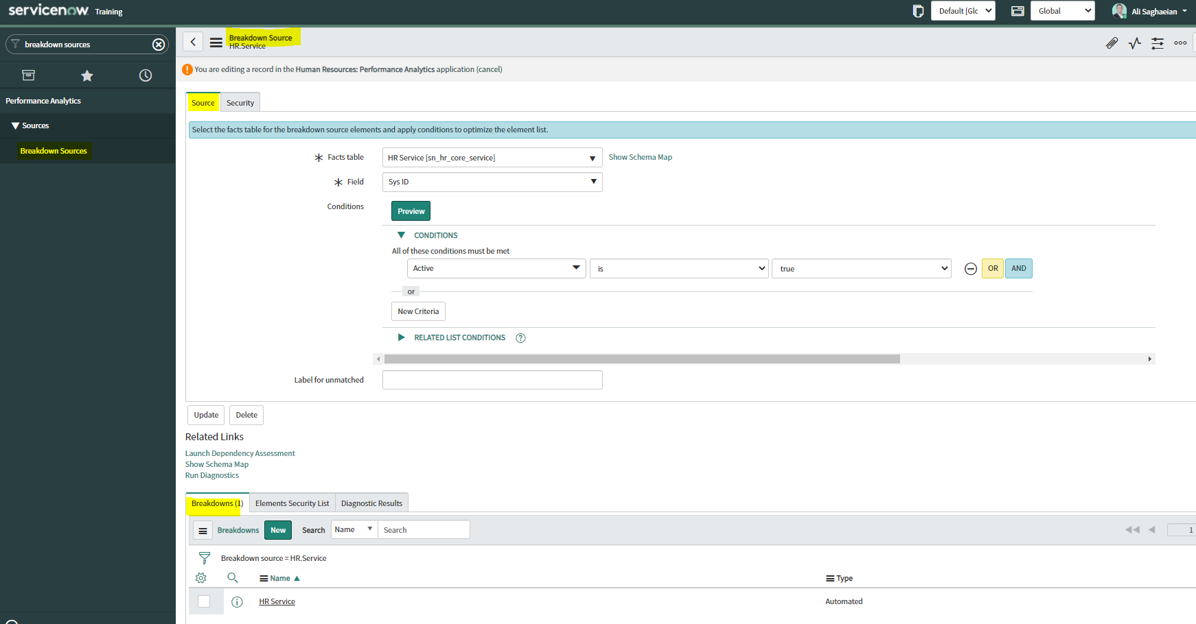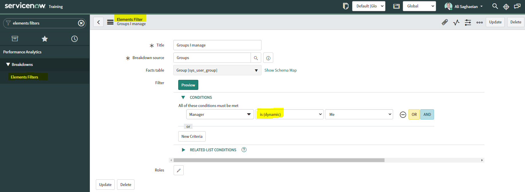 When you create an element filter, you can include conditions on a related field in a different table than the breakdown source table. Element filters enable you to limit the displayed breakdown elements on an Analytics Hub or widget using filter conditions, including personalised visuals. You can select an element filter when viewing breakdowns on an Analytics Hub or configuring a breakdown widget. For example, you could create an element filter on the Groups breakdown source, which uses the Group [sys_user_group] table. If you added a related list condition on Incident [incident]->Assignment group, you would get only groups that had an incident assigned to them. If this condition included [[Created][on][Last 6 Months]], you would get groups that were assigned an incident that was created within the last six months. Screenshot: Applying Related List Conditions on the Elements Filter record Learn more here!