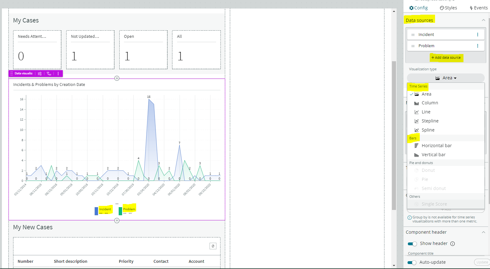 You can add multiple data sources of the same type for time series (including Area, Column, Line, Stepline, and Spline) and bar (including Horizontal bar and Vertical bar) visualisations.
