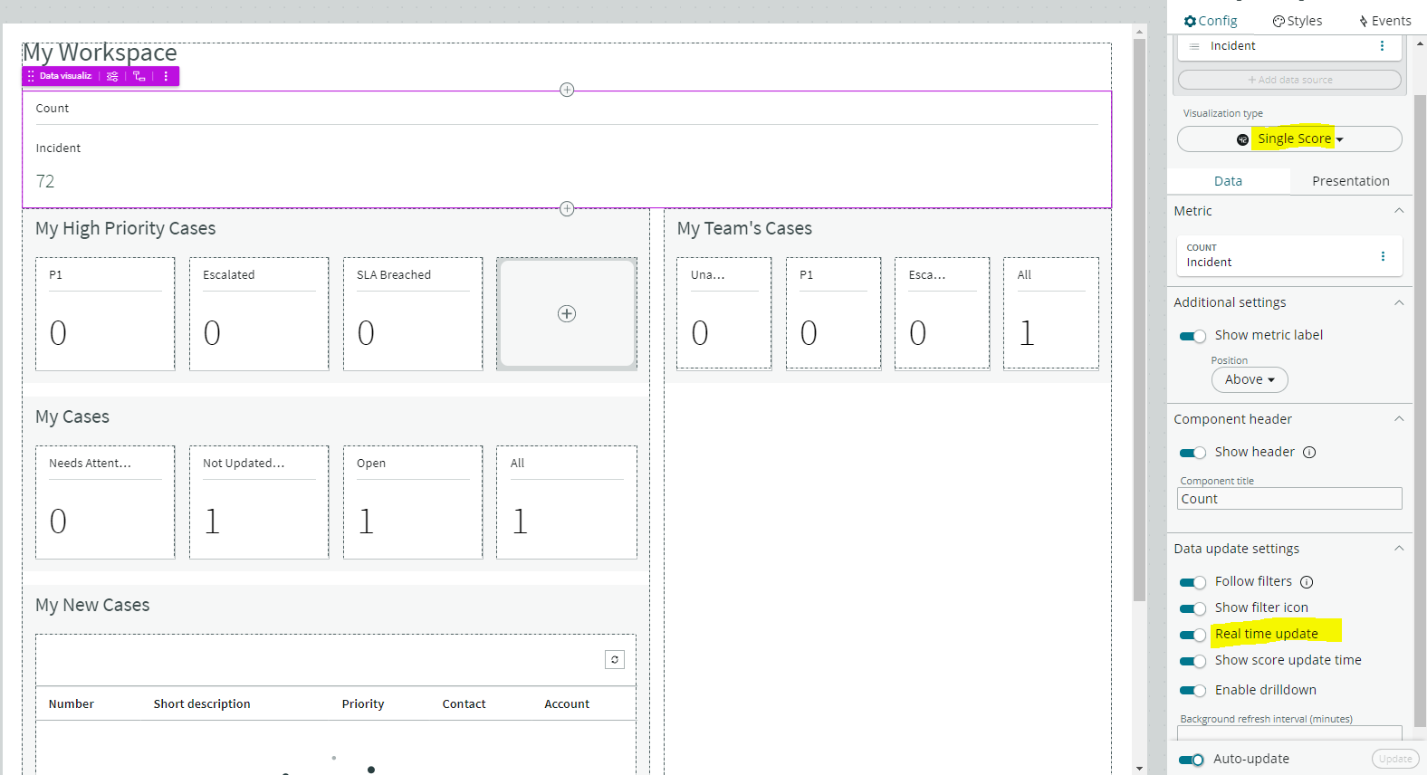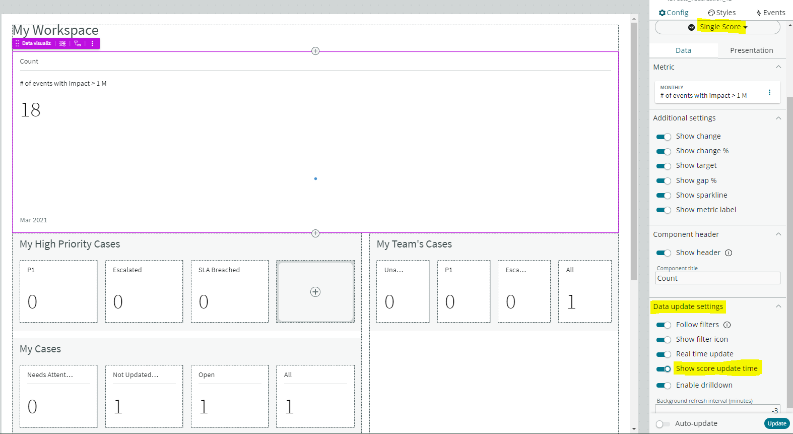 Enabling ‘Real time update’ from the data update settings updates a single score visualisation in real-time.