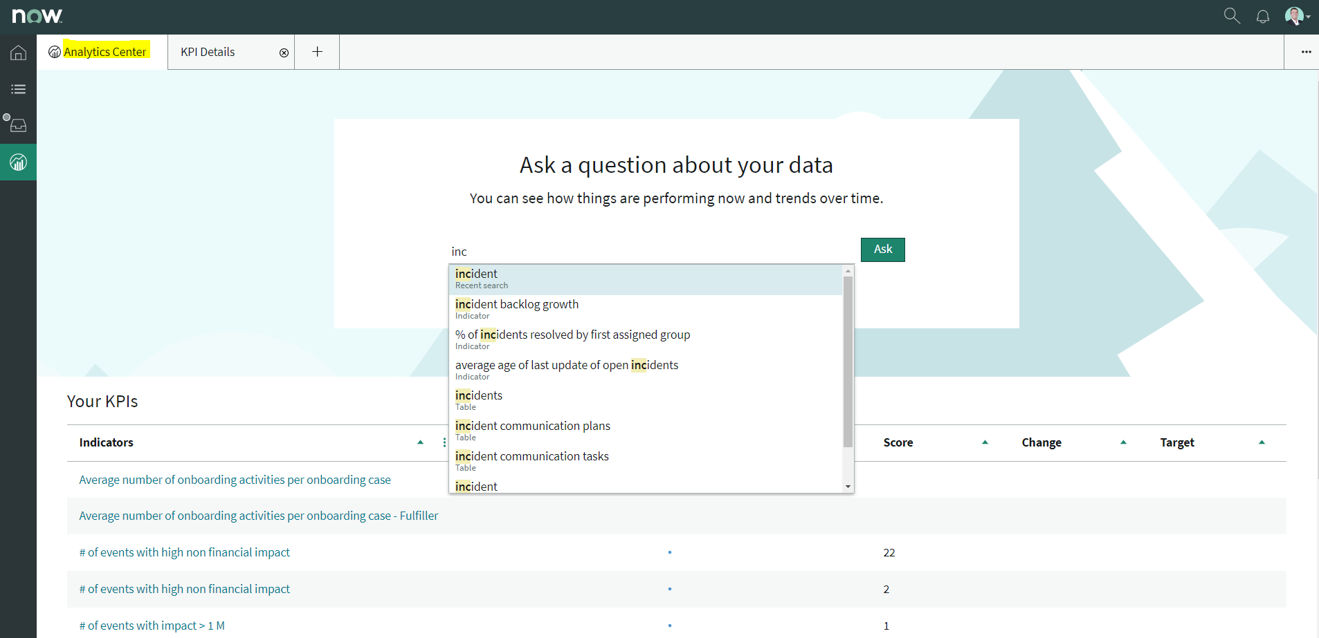 When you use Analytics Q&A, the suggestions from previous searches are now shown together with the suggested indicators, tables, and columns.