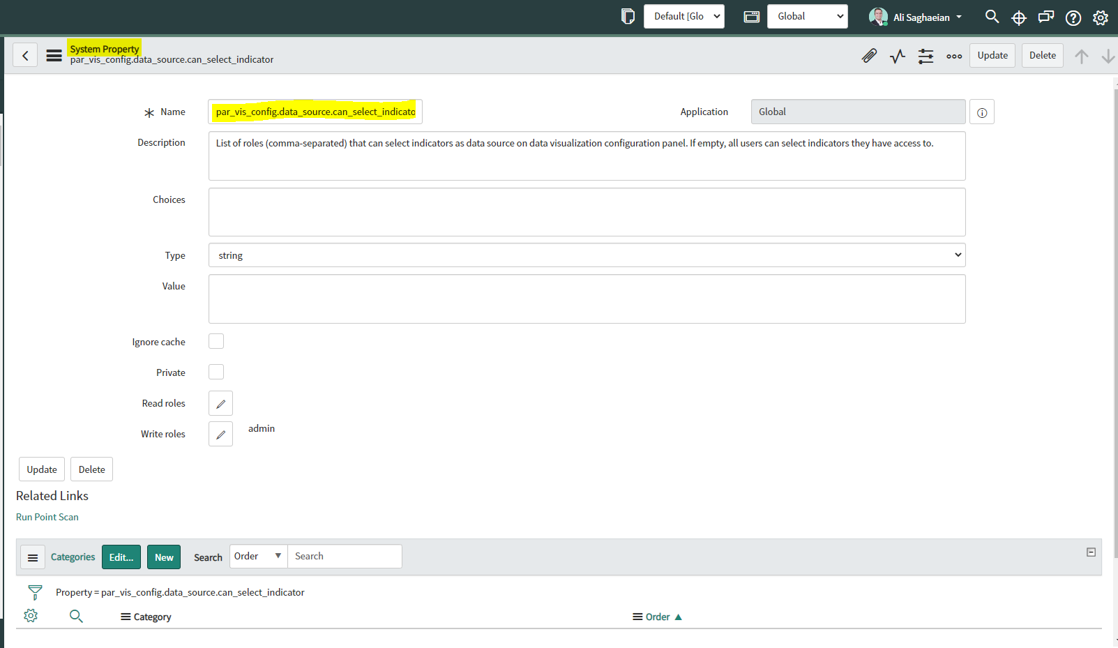 Screenshot: The system property for allowing roles to select indicators as data sources