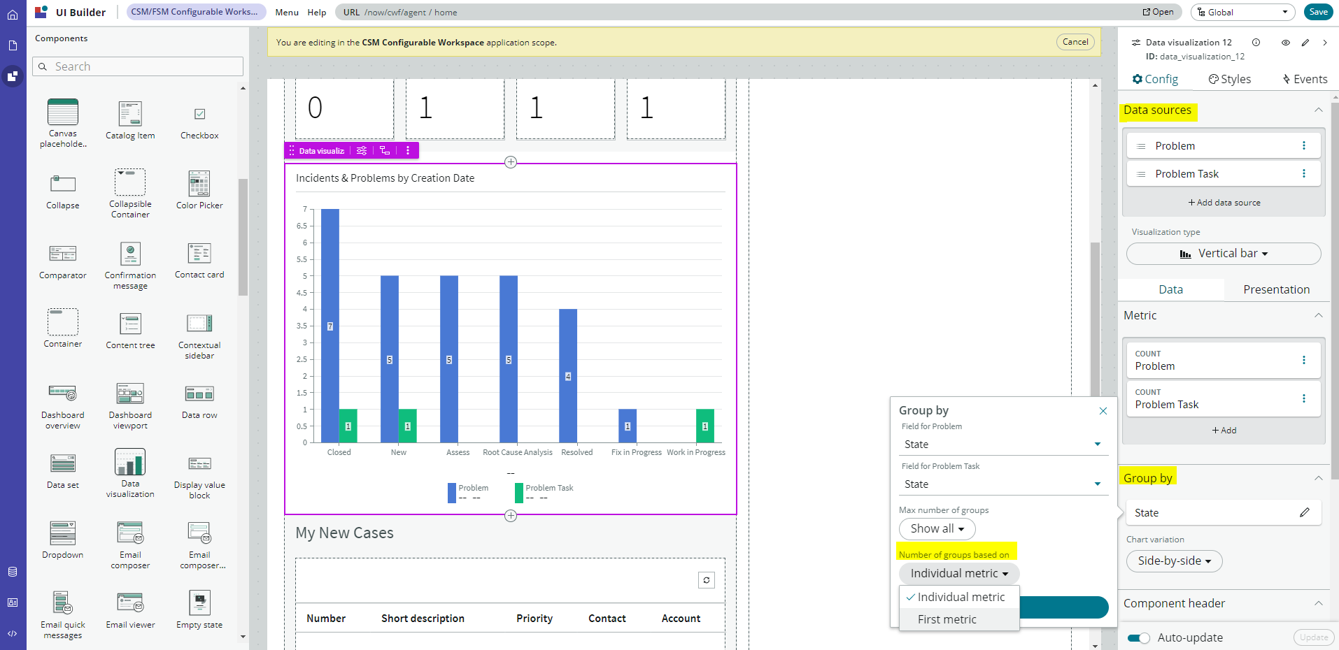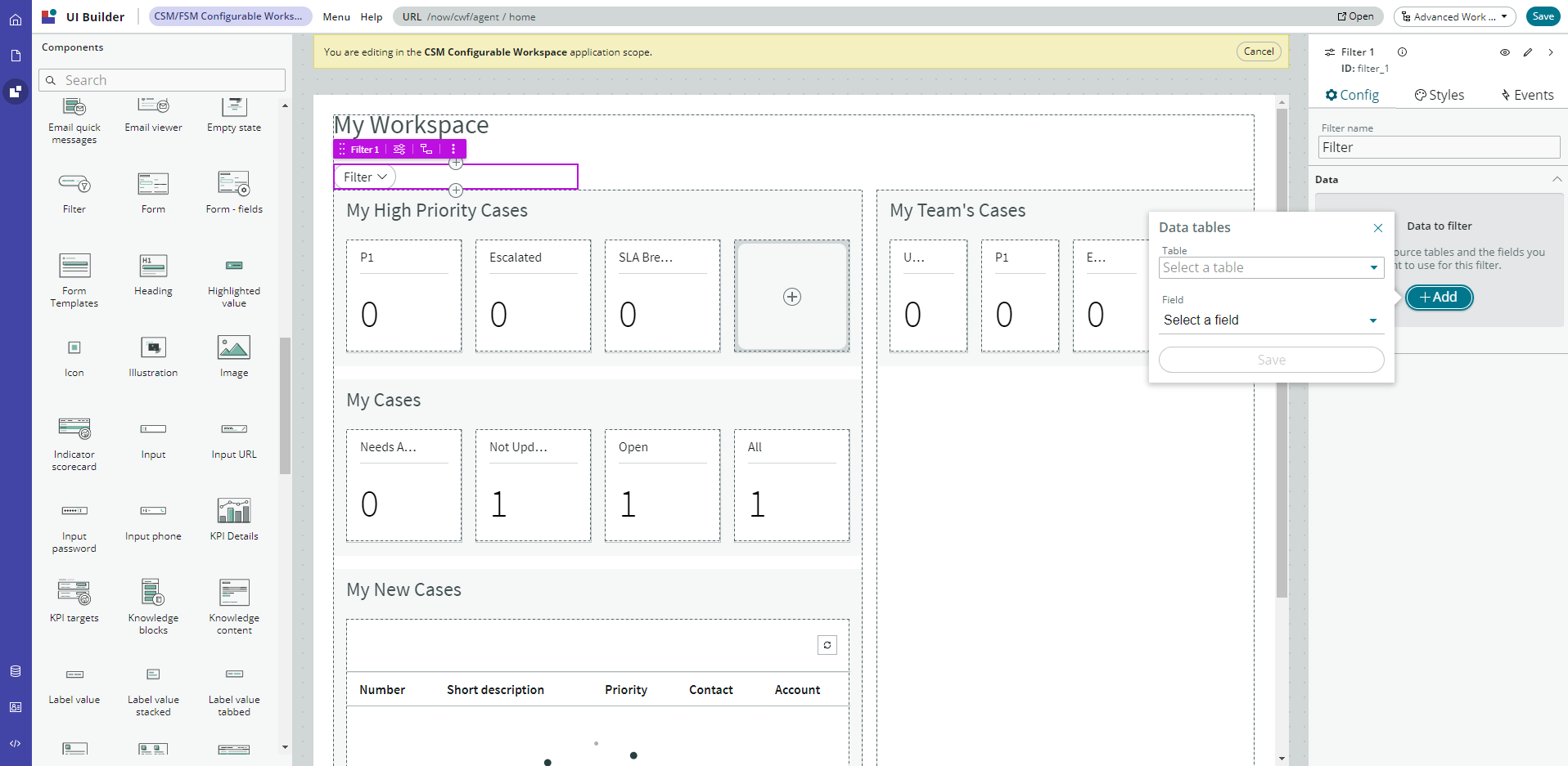 You can create a single filter for use across all the visualisations in a workspace. Creating User Experience filters requires admin access. The filter you create is available in the workspace in which you created it. For filters to work in workspaces, you must configure an event handler to apply the filters. Screenshot: Using Now Experience UI Builder to create a filter for a workspace