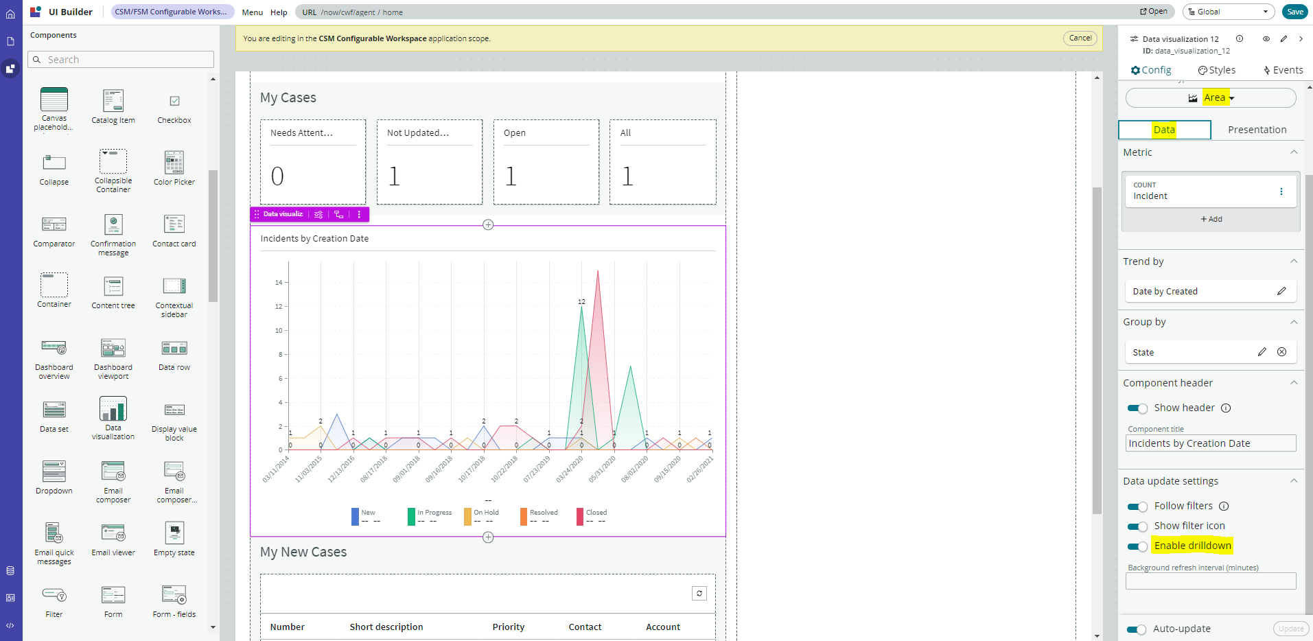 Screenshot: Setting the ‘Enable drilldown’ option from the UI Builder Data tab