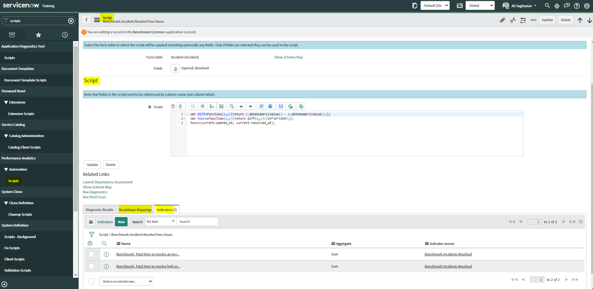 Script records have related lists for the breakdown mappings and indicators that use the script.