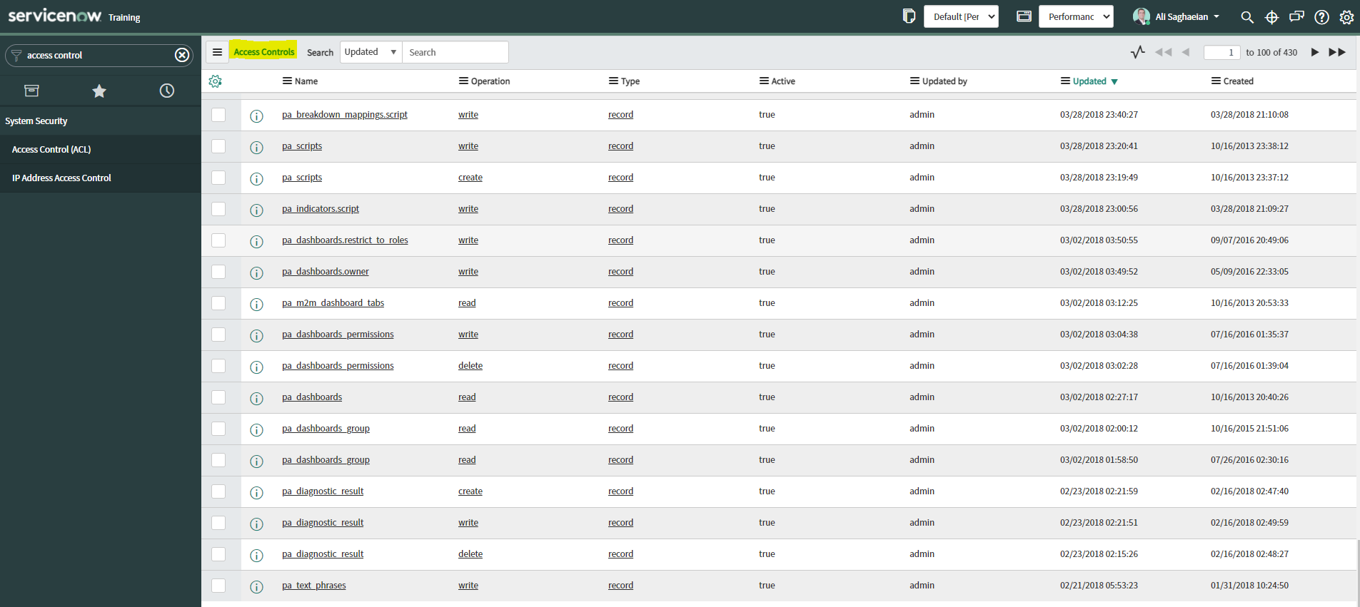 Screenshot: List of out-of-the-box Access Controls for Performance Analytics