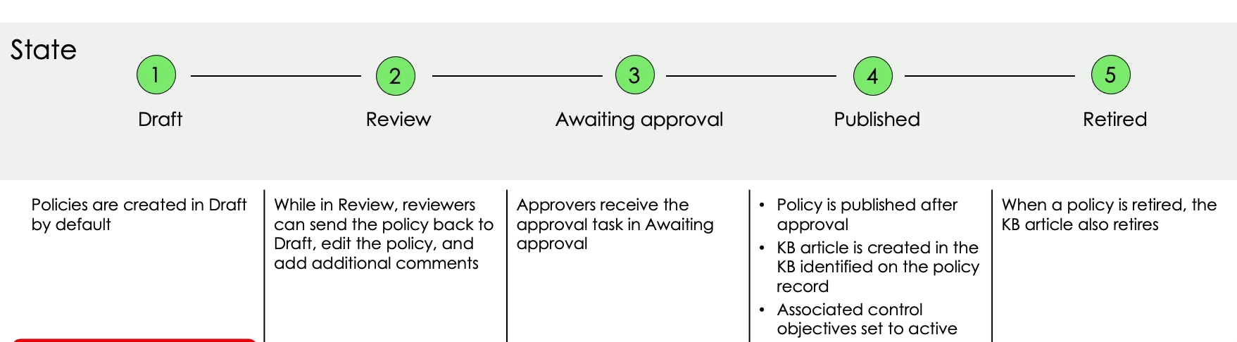 The ServiceNow baseline Policy Lifecycle includes states such as Draft, Review, Awaiting Approval, Published and Retired. Therefore, ‘Review‘ and ‘Published‘ are the correct answers. Expired, Acknowledged and Verified are not typically included as baseline states in the policy lifecycle.